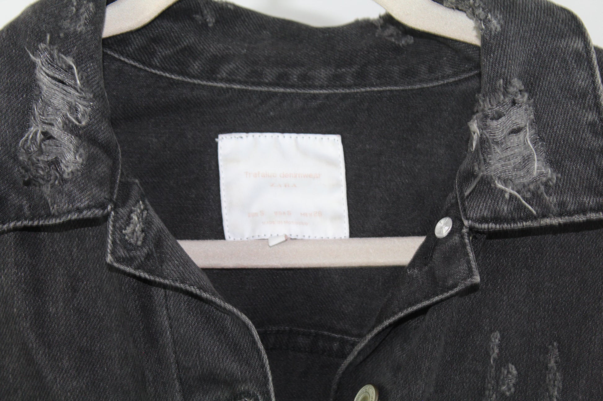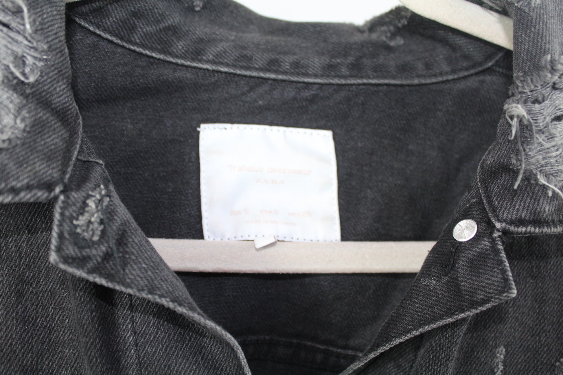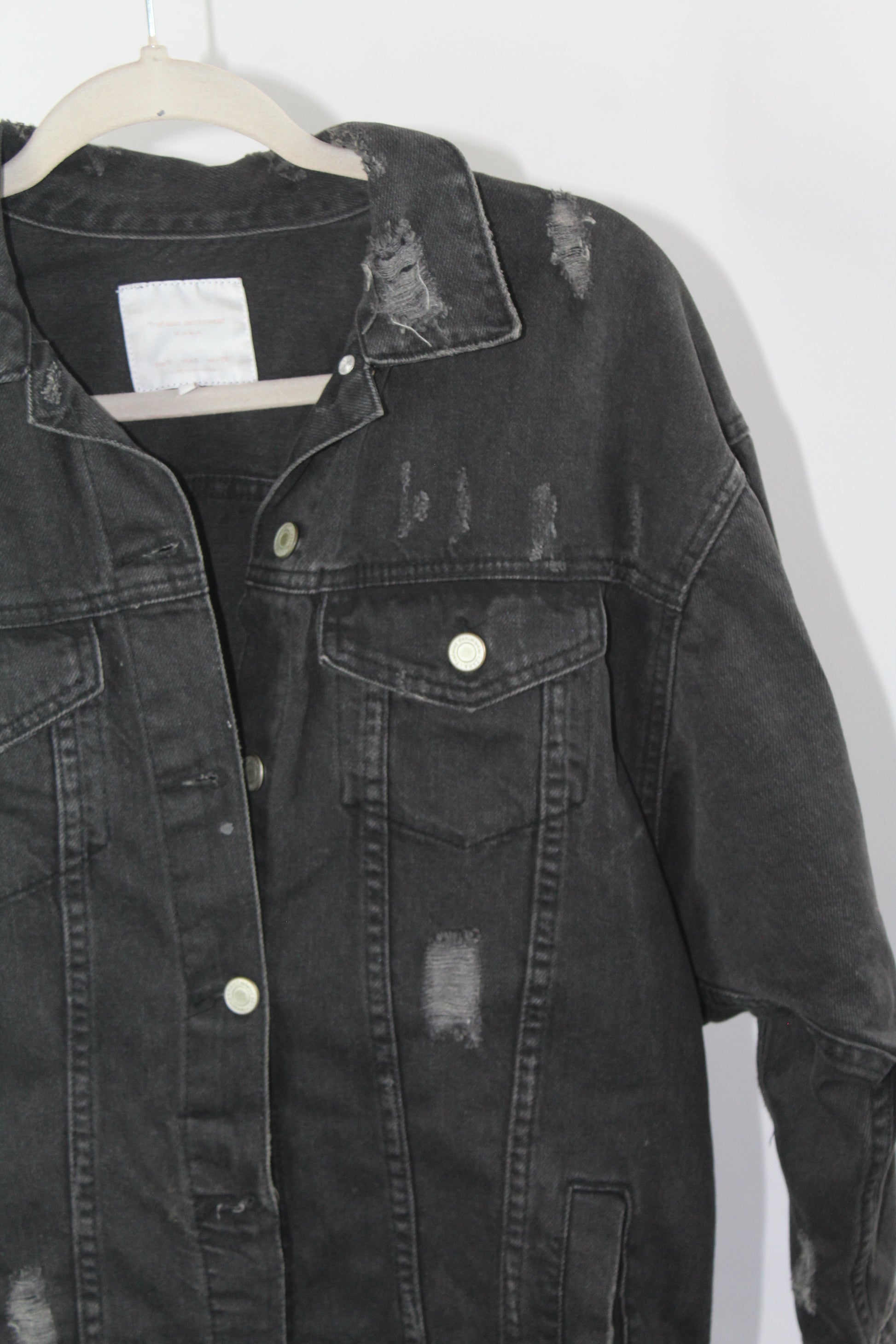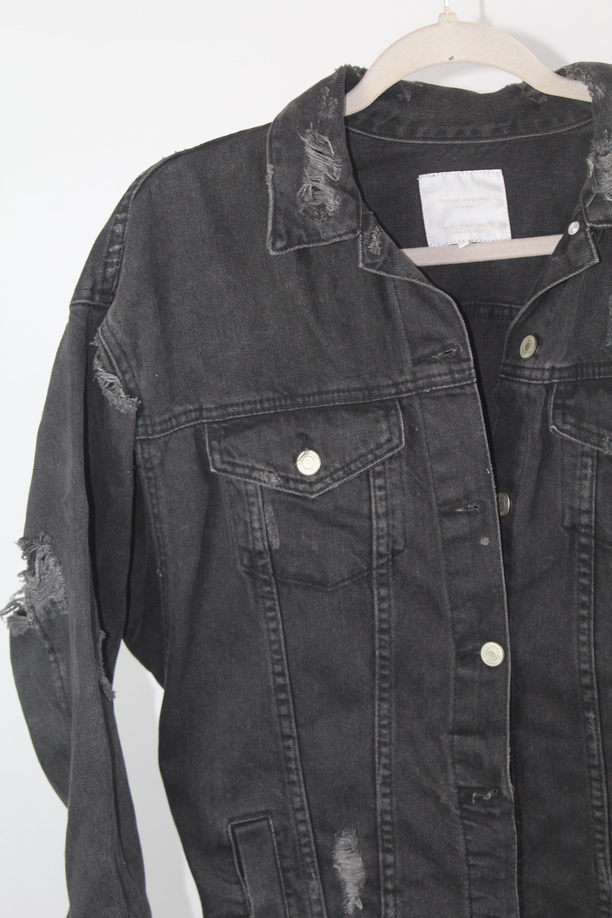 Add an effortlessly edgy touch to your outfit with this Zara Trafaluc distressed denim jacket in size small. Featuring a classic light-wash finish with trendy frayed details, this jacket is your go-to outerwear for laid-back, streetwear-ready style. Layer it over dresses, tees, or hoodies for an always-cool look.